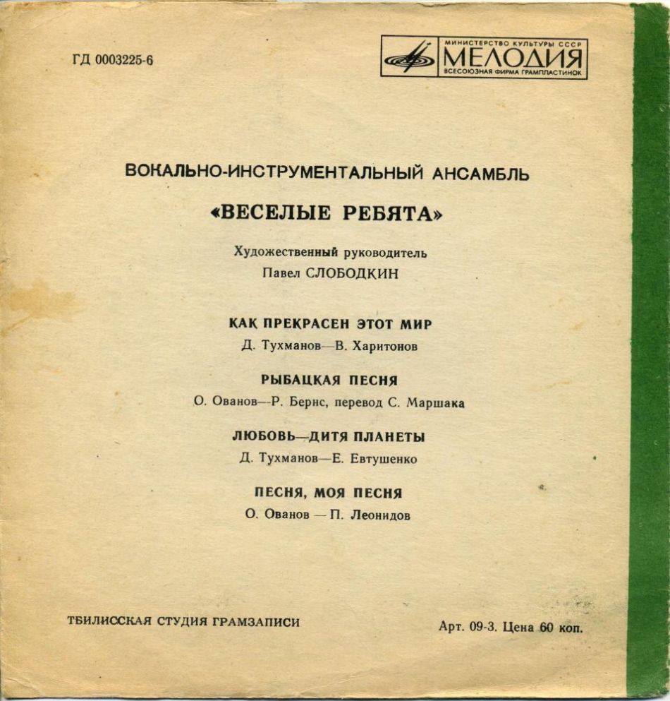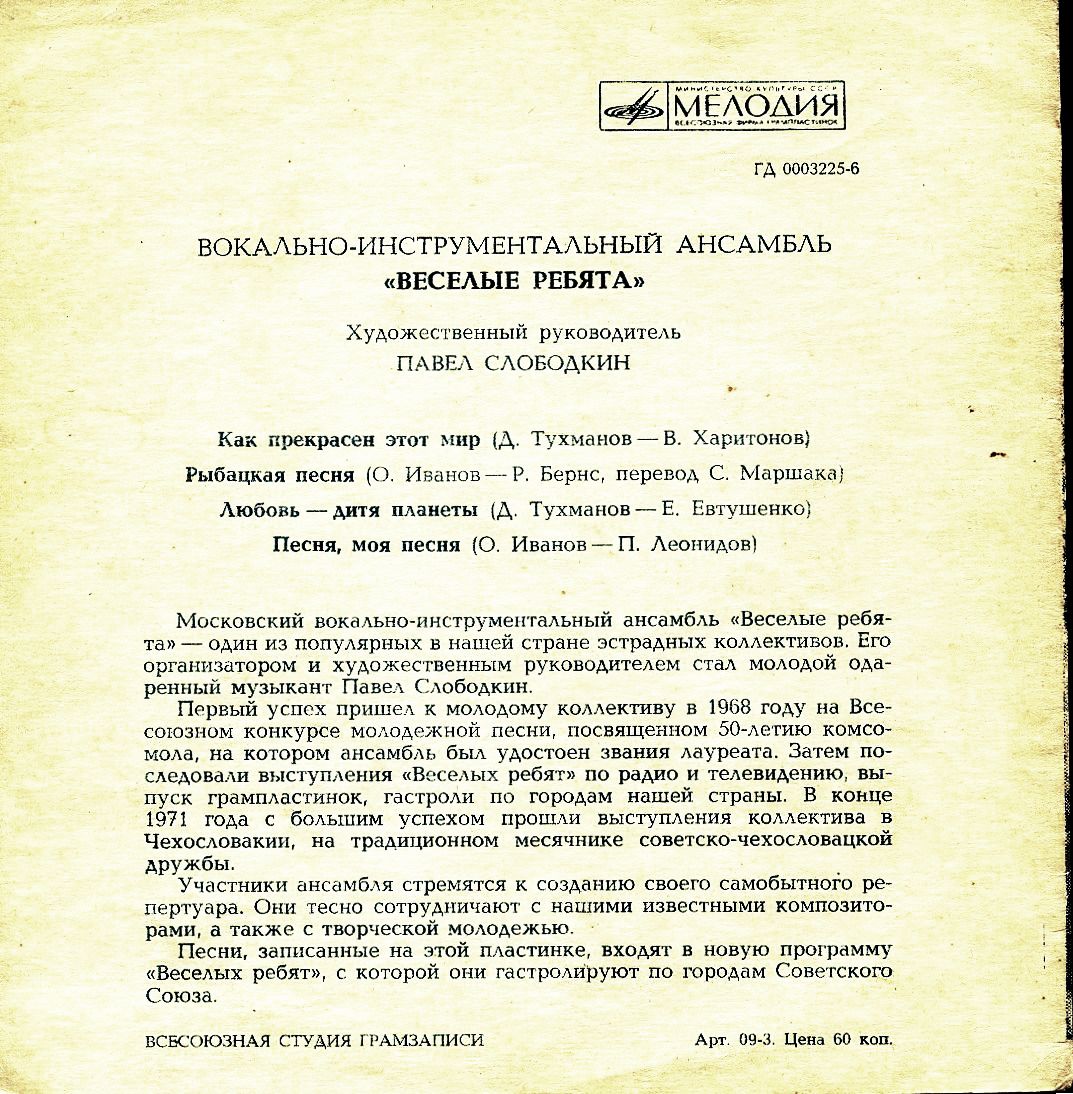 ВСГ Сторона 1 - «Как прекрасен этот мир». (Д. Тухманов - В. Харитонов) - «Рыбацкая песня». (О. Иванов - Р. Бернс,перевод С. Маршака) Песня записана на "Мелодии" в 1971 г. Вокальная группа - Ю.Петерсон, А.Пузырев, В.Витебский, Е.Казанцев, В.Фазылов. Соло-гитара - В.Хабазин, бас-гитара - В.Витебский, ударные - В.Полонский, клавишные - П.Слободкин, |