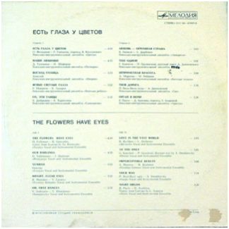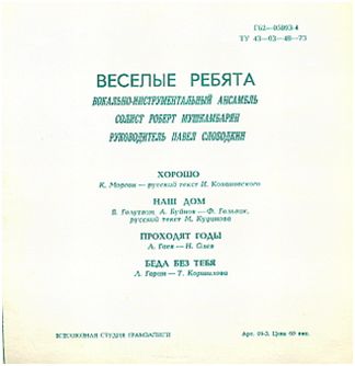 Сторона 1 - «Хорошо». (К. Морган – русский текст И. Кохановского) Солист Роберт Мушкамбарян. - «Наш дом». (В. Голутвин, А. Буйнов –Ф. Гольвик, русский текст М. Кудинова) Вокал: Александр Буйнов и Александр Чиненков. На скрипке-Анатолий Алешин,на рекордере-Александр Чиненков. Сторона 2 - «Проходят годы». (А. Гаев - Н. Олев) Солист Игорь Гатауллин. - «Беда без тебя». (Л. Гарин – Т. Коршилова) |