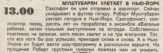 Саксофон он уже отправил в аэропорт. Сейчас укладывает в футляр гитару. Роберт Муштубарян улетает сегодня в Нью-Йорк. Саксофонист, композитор, певец, десять лет он проработал в ансамбле «Веселые ребята», затем сольные выступления на эстраде. Собственных пластинок не записал, хотя песен хватит и на три «гиганта». Тот, кто его хотя бы раз услышал, приходил снова и снова. А в Нью-Йорке он будет вести шоу-программу в роскошном варьете. На прощание Роберт грустным голосом пожелал нам не унывать.