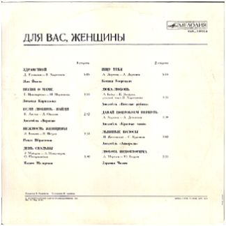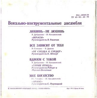 Сторона 1 - «Наша дискотека» - (3.34) (В. Раинчик - М. Танич) - «Малиновки заслыша голосок» - (2.28) (Э. Ханок - А. Поперечный) Сторона 2 - «Белый парус» - (3.02) (Е. Глебов - Б. Окуджава) - «Люблю тебя» - (3.25) (И. Якушенко - В. Харитонов) |