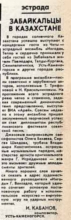 В городах солнечного Казахстана успешно выступают с концертами гости из Читы эстрадный ансамбль «Ингода». Тепло и сердечно принимали у себя гостей из Забайкалья жители Павлодара, Талды-Кургана, Семипалатинска, Усть-Каменогорска и других городов республики.