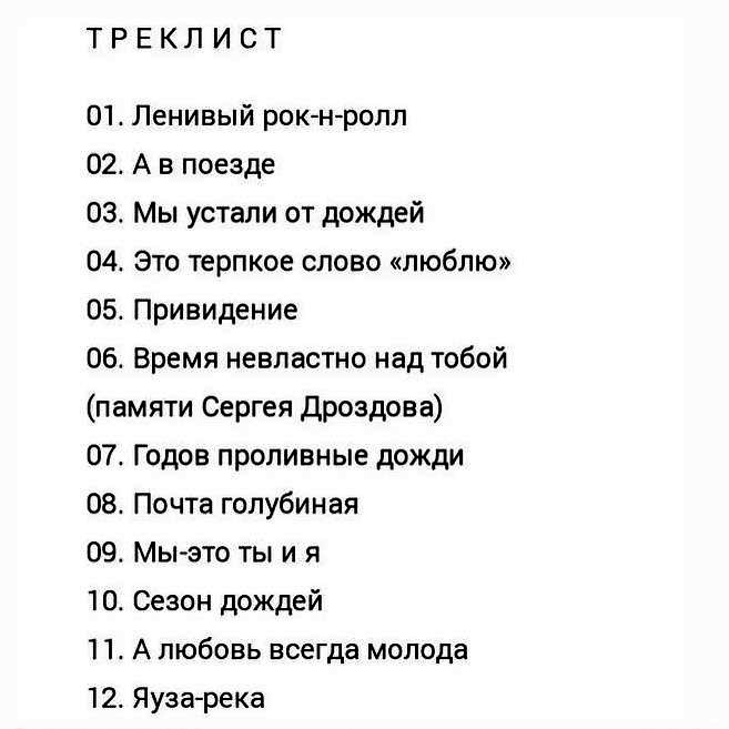 Хороший альбом. Песни ориентированы на разного слушателя. Здесь и рокешники, и песни-настроения и задушевные баллады. «Зимой вьюгами с крыш, летом грибным дождём…» Партия фоно, мелодика песни, доверительная манера исполнения этой песни напомнили бернесовские интонации. А, может быть, Вячеслав найдёт возможность спеть версию этой песни на два голоса с соавтором Юрием Валовым? Кроме «ленивого» рок-н-ролльного стандарта, с особым удовольствием слушаю фолковые интонации «почты голубиной» и выразительную инструментальную оркестровку «Яузы-реки».