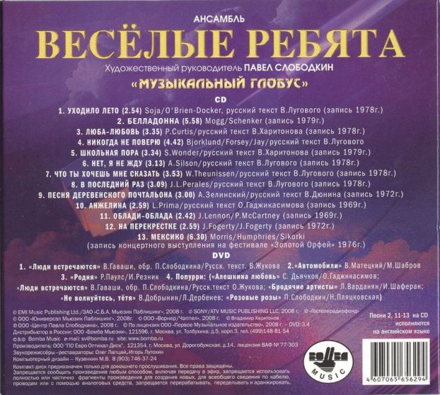 Цитата Было бы интересно узнать авторов песен "Сон" (Портрет работы Пабло Пикассо) и "Сеньорита, я влюблен" на конверте альбома. ------ Сергей, авторы были бы правильные: - Сон (Портрет работы Пабло Пикассо) (Wladyslaw Szpilman, обр. П.Слободкин/русск.текст О.Гаджикасимов) - Серенада (Сеньорита, я влюблен) (Salvatore "Toto" Cutugno, обр. П.Слободкин/русск.текст Л.Дорохина (Л.Ворапаева)) ПЯС ещё при жизни продемонстрировал, что на обложках он указывает правильных авторов. Даже исправил все ошибки, которые были на обложке LP «Музыкальный глобус».