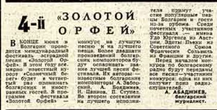 В КОНЦЕ июня в Болгарии проводится международный Фестиваль эстрадной песня «Золотой Орфей». В этом году всемирно известный курорт «Солнечный берег» будет в четвертый раз принимать болгарских и иностранных гостей. В программе фестиваля «Золотой Орфей» конкурс на лучшую песню и на лучшего певца. Более двадцати болгарских композиторов будут оспаривать звание лучшей песни фестиваля. Их авторы - известные болгарски композиторы А. Заборский, А. Бояджиев, И. Цанков, П. Ступел. Во втором состязании на лучшего исполнителя примут участие популярные певцы Болгарии и гости из-за рубежа. Среди почетных участников фестиваля - имена Удо Юргенса из Австрии Эдаты Пьехи из Советского Союза Франчески Сольвиль из Франции и другие.