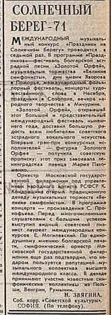 «Золотой Орфей», открывший этот большой и представительный международный фестиваль нынешнего года, доставил большую радость всем любителям советского эстрадного вокального искусства. Впервые гран-при, конкурсных исполнителей фигурка Золотого Орфея - получила советскую прописку, этот приз завоевала ленинградская певица Мария Пахоменко.