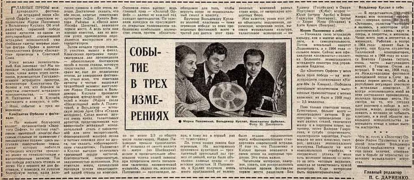 ГЛАВНЫЕ ПРИЗЫ международного фестиваля эстрадной песни «3олотой Орфей» -советским исполнителям Марии Пахоменко и Вольдемару Куслапу. Об этой радостной, серьезной победе наших артистов на одном на популярнейших соревнований эстрадных исполнителей уже сообщали газеты: впервые золотая фигура Орфея и золотая грампластинка фирмы «Балкантон» привезены в Советский Союз.