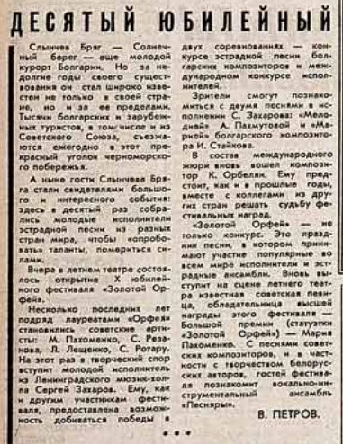 Несколько последних лет подряд лауреатами «Орфея» становились советские артисты: М. Пахоменко, С. Резанова, Л. Лещенко, С. Ротару. На этот раз в творческий спор вступит молодой исполнитель из Ленинградского мюзик-холла Сергей Захаров. Ему, как и другим участникам фестиваля, предоставлена возможность добиваться победы в двух соревнованиях - конкурсе эстрадной песни болгарских композиторов и международном конкурсе исполнителей.