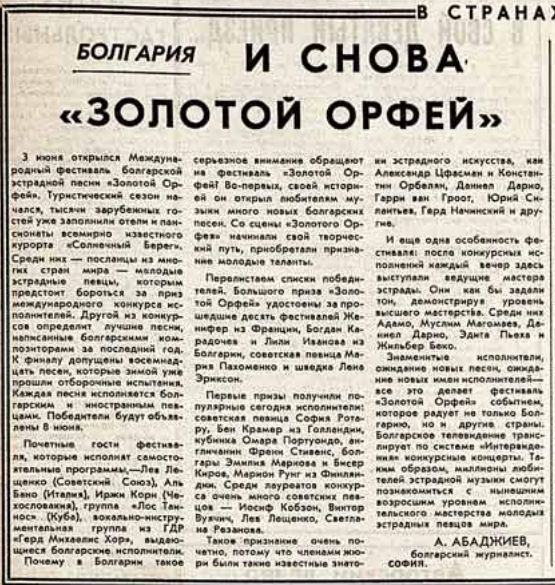 3 июня открылся Международный фестиваль болгарской эстрадной песни «Золотой Орфей». Туристический сезон начался, тысячи зарубежных гостей уже заполнили отели и пансионаты всемирно известного курорта «Солнечный Берег». Среди них посланцы из многих стран мира молодые эстрадные певцы, которым предстоит бороться за приз международного конкурса исполнителей. Другой из конкурсов определит лучшие песни, написанные болгарскими композиторами за последний год. К финалу допущены восемнадцать песен, которые зимой уже прошли отборочные испытания. Каждая песня исполняется болгарским и иностранным певцами. Победители будут объяв лены В июня.