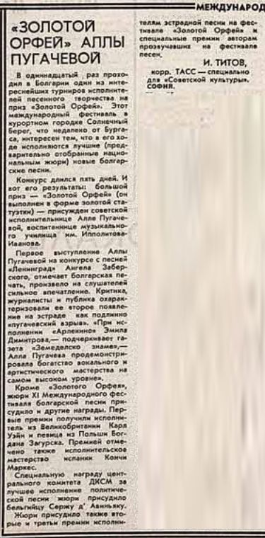 Конкурс длился пять дней. И вот его результаты: большой приз «Золотой Орфей» (он выполнен в форме золотой статуэтки) присужден советской исполнительнице Алле Пугачевой, воспитаннице музыкального училища им. Ипполитова-Иванова.