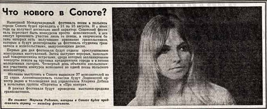 Нынешний Международный фестиваль песни в польском городе Сопоте будет проходить с 21 по 25 августа. И с этого года он получает несколько иной характер: Сопотский фестиваль перестает быть конкурсом просто исполнителей, в нем смогут принимать участие лишь те певцы, в творческом багаже которых есть получившие признание грампластинки, которые и будут делегированы на фестиваль студиями грамзаписи и издательствами, выпускающими диски.