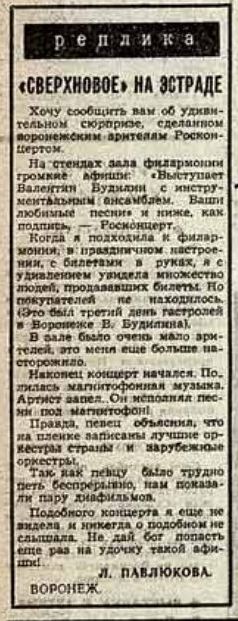 Когда я подходила и филармония, в праздничном настроении, с билетами в руках, я с удивлением увидела множество людей, продававших билеты. Но покупателей не находилось. (Это был третий день гастролей в Воронеже В. Будилина).