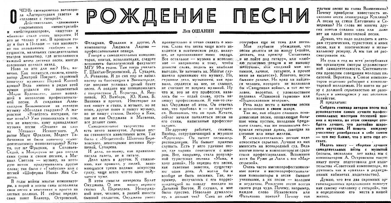 Говоря о самодеятельных композиторах, поэтах, исполнителях, следует вспомнить биологический факультет МГУ 50-х годов. Там тогда учились Г. Шангии-Березовский, Д. Сухарев, Л. Розанова. Я до сих пор не забыл костер на биостанции в Звенигороде, где впервые услышал целый букет песен. А позднее мы познакомились с творчеством Д. Борисова, А. Якушевой, Ю. Визбора, Ю. Кима, Б. Вахнюка и прочих. Некоторые из них пишут и стихи, и музыку, но не поют, другие поют и пишут музыку, но не пишут стихов. Визбор и Ким, так же как Окуджава и Матвеева, все делают сами.
