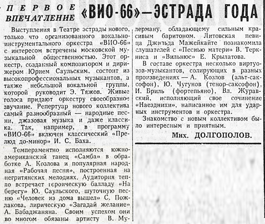 Выступления в Театре эстрады нового только что организованного вокально инструментального оркестра «ВИО-66» с интересом встречены московской музыкальной общественностью. Этот оркестр, созданный композитором и дирижером Юрием Саульским, состоит из высокопрофессиональных музыкантов, а также небольшой вокальной группы, которой руководит Э. Тяжов. Живые голоса придают оркестру своеобразное звучание. Репертуар нового коллектива самый разнообразный - народные песни, джазовая музыка и даже классика. Так, например, в программу «ВИО-66» включен классический «Прелюд до-минор» И. С. Баха.